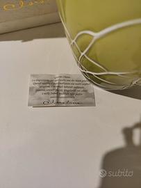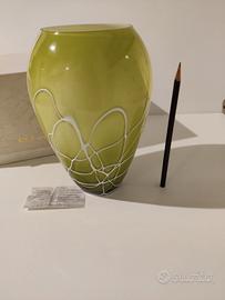 Vaso porta fiori vintage di un bel verde sfumato e decorazione bianche “a ragnatela”.