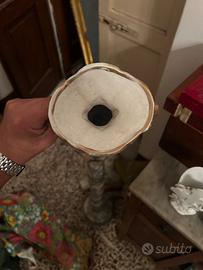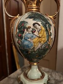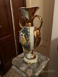 Bellissimo vaso decorativo stile classico dipinto a mano con decorazioni in rilievo con dettagli dorati in ceramica. Al centro, è visibile una scena dipinta raffigurante due figure in un paesaggio, probabilmente una scena bucolica o romantica.