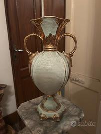 Il vaso è dotato di due manici laterali e poggia su una base elaborata.