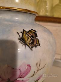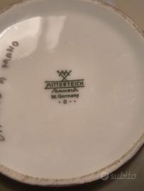 vaso in ceramica dipinto a mano,di manifattura tedesca degli anni ottanta almeno,visto che nel marchio è ancora presente la dicitura W. GERMANI (west Germani - Germania dell 'est) quindi prima della caduta del muro di Berlino, (1989) bella la pittura fatta su due lati e finiture dei bordi e del pennacchio del coperchio in oro zecchino,bella dimensione con misure di altezza cm 35 e diametro di cm 20