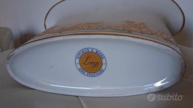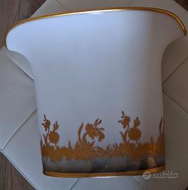 Set vaso e portasigarette ceramica con dettagli oro zecchino. Il vaso presenta una scheggiatura su parte bassa.Si accettano proposte.