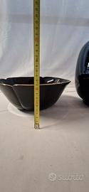 Set composto da un vaso e una ciotola in ceramica, entrambi con decorazioni raffinate. Vaso in ceramica blu scuro con decorazioni di gru e vegetazione. Ciotola in ceramica nera con bordo dorato e decorazioni interne.