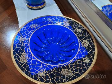 vaso e piatto in vetro blu con inserto color oro