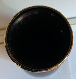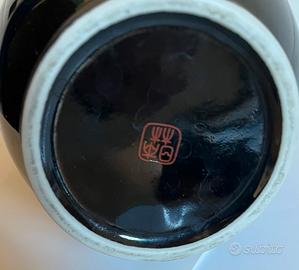 Splendido vaso giapponese vintage in porcellana nera lucida con ricchi decori in oro e motivi floreali. Il vaso presenta una raffinata raffigurazione di peonie e fiori autunnali, arricchita da dettagli dorati in rilievo che donano grande luminosità. Altezza 32 cm Vaso Giapponese Vintage in Porcellana Nera e Oro - Decoro Floreale