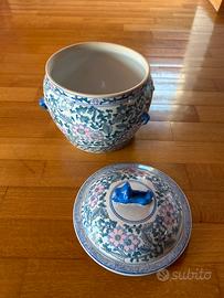 Elegante vaso in ceramica smaltata decorato con motivi floreali blu e rosa, tipici della tradizione orientale.
