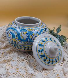 Splendido vaso in ceramico con coperchio, un'opera d'arte decorativa interamente dipinta a mano e firmata dall'artista-ceramista Pippo Cetona (fondatore della storica bottega di Cetona, in Toscana).