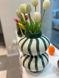 Vendo splendido vaso decorativo in ceramica con design a doppia sfera. L'oggetto è caratterizzato da un motivo a righe verticali verde bosco su base bianca, interamente dipinto a mano. Uno stile che unisce il classico al moderno, perfetto come centrotavola o elemento d'arredo per soggiorni e ingressi ricercati. Dettagli dell'articolo: Condizioni: NUOVO, mai usato, completo di scatola originale (perfetto per un regalo). Lavorazione: Ceramica smaltata con decorazione artigianale a mano. Design: Silhouette sinuosa a "doppia bolla", molto attuale e di tendenza. Versatilità: Ideale sia per fiori freschi che per composizioni a secco (come i tulipani in foto). Prezzo: 100€