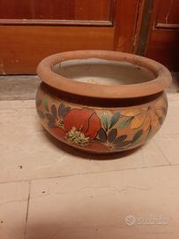 Vaso in ceramica dipinto a mano con motivi floreali, altezza 15 cm, diametro esterno apertura 25 cm.