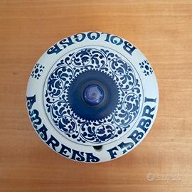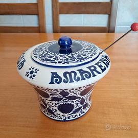 Vaso in ceramica nuovo della azienda:Maioliche Deruta. Vaso contenitore per le famose amarene Fabbri. Oggetto da collezione, con allegato certificato di originalità.