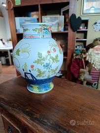 Vaso in ceramica di Faenza decorato con motivi floreali e un uccello tipico della maiolica faentina. Ceramica smaltata.