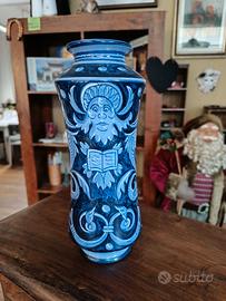 Vaso in ceramica smaltata blu e bianca, presenta decorazioni con motivi rinascimentali. Ricorda la tradizione dell'erboristeria rinascimentale