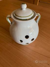 Vaso in ceramica forato con coperchio e due manici per aglio. Altezza cm 18.