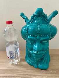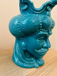 Vaso in ceramica a forma di testa di moro. Dimensioni medio-grandi (vedi ultima foto per capirne la dimensione dello stesso). Colore azzurro. Usato come soprammobile e non come vaso.
