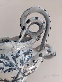 Vaso a due manici dalle eleganti volute, di VITTORIA MAZZOTTI, della tradizione ceramista di Albisola (Savona) decorato secondo lo stile ANTICO SAVONA o BIANCO E BLU da G. SPADANO