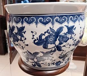 vendo vaso in ceramica con decorazioni e colonna portavaso in legno h. 92cm. Diametro vaso cm. 31.
