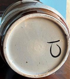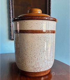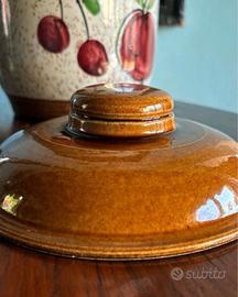 Grande barattolo vintage per Rumtopf in ceramica color crema con particolare coperchio marrone; il barattolo presenta striature scure. Questo grande barattolo veniva utilizzato per preparare e conservare il Rumtopf, una bevanda dolce, un dessert invernale a base di rum e frutta che serviva principalmente per conservarlo; il contenitore è in perfette condizioni, data la sua età, con ciliegie e forse una mela dipinte sul davanti. È alto 28 cm con il coperchio, 23,5 cm senza e ha un diametro di 20 cm. #rumtopf #vintagerumtopf #vintage #madeingermany #rumandfruit #bbitalianartvintage #etsy #rum #winterdesserts #fruit #fruitpreserves #fruitinal