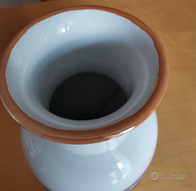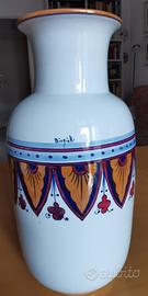 Vaso in ceramica smaltata - Bingiotti Decorato a mano con motivi geometrici e floreali con toni di arancio , marrone e azzurro su base bianca. H. Cm. 30, base cm. 10