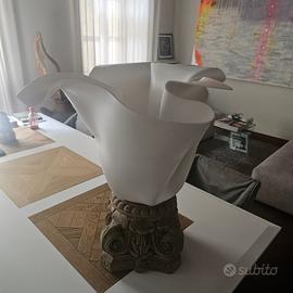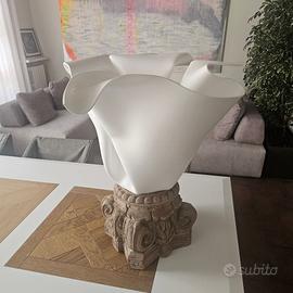 Il vaso è realizzato in Corian bianco termoformato a mano, su base costituita da capitello in teak indonesiano, proveniente da un edificio storico indiano dismesso. I due elementi possono essere disgiunti. Dimensione complessive, altezza 70cm, larghezza massima 65cm, lunghezza 45cm.