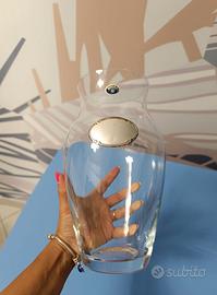 Vaso in cristallo di Boemia di dimensioni medie. Molto semplice nelle linee, ma elegante nella sua semplicità. Presenta sul davanti una piccola placchetta in silver, placchetta che ha perso nella parte superiore (bordino di sopra) un pó della sua originale lucentezza (vedi ultime 2 foto allegate), anche se questo non pregiudica la bellezza del vaso. Lo metto in vendita per cambio arredamento. A parte questo piccolo difetto, il vaso è perfettamente integro, non ha nessun graffio o lesione di alcun tipo. Altezza 25 cm, il diametro nella parte più larga è di circa 15 cm, mentre è di circa 9 cm nella parte più stretta (bocca)