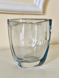 Vaso in cristallo realizzato negli anni ‘60 dal celebre maestro vetraio svedese Vicke Lindstrand per Orrefors, decorato da una coppia di cigni incisi a ruota con diverse profondità per dare un effetto tridimensionale e con firma incisa a mano sul fondo. In condizioni perfette, senza sbeccature o zone opache.