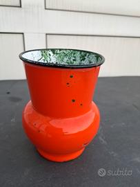 Vasetto in latta smaltata di colore arancione. Articolo vintage con evidenti segni di usura , che conferiscono il carattere di oggetto vissuto.