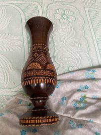 Vaso in legno massiccio d’epoca tornito e intagliato a mano, decorato con motivi geometrici A schegge di arte popolare cm 28x9 Molto bello
