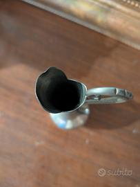 Vaso in peltro con manico decorato. Altezza max 18 cm. Venduto visto e piaciuto.