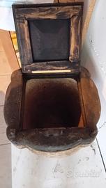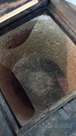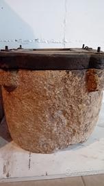 Qui ci troviamo di fronte ad un oggetto di culto, storico e direi quasi archeologico. Si tratta di un vaso in pietra, scolpito a mano in maniera completamente artigianale, che veniva utilizzato per conservare l'olio extra vergine di oliva e potrebbe essere ancora utilizzato per tale scopo. Questo manufatto ha almeno 200 anni di vita, ma molto probabilmente anche di più, dovrebbe risalire alla fine del '700. Potrebbe stare in una taverna rustica, dentro un oleificio o altri ambienti adatti ed esclusivi. Il prodotto essendo pura roccia è molto pesante, il coperchio è in legno.