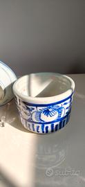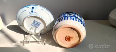 vaso con piattino in porcellana bianca e blu Cina antica, come da foto. alti circa 10/12 cm.