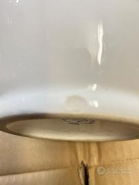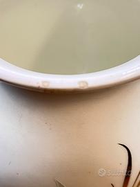 Bellissimo vaso in porcellana bianca con decoro floreale dipinto a mano — fiori rosa su sfondo avorio con dettagli dorati e foglie verde salvia. Firmato Riales. Dimensioni: circa 35 cm di altezza. ⚠ Piccola sbeccatura sul bordo superiore, visibile solo da vicino. Non pregiudica l'estetica generale. Prezzo ridotto di conseguenza. Perfetto come elemento decorativo da esporre. Adatto a contenere liquidi. Altezza 31 Diametro bocca 11 Diametro fondo 11 Diametro centrale 16 Peso 1,3kg