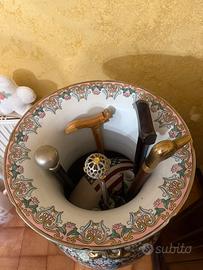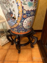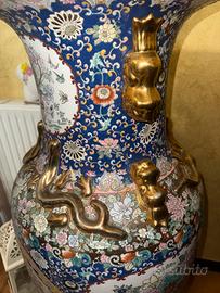 Questo è un imponente vaso in porcellana in stile Cantonese (Famille Rose), tipicamente prodotto per il mercato delle esportazioni. Si tratta di un pezzo molto decorativo, caratterizzato da una ricchezza visiva estrema e da un mix di elementi tradizionali cinesi. Il vaso presenta diverse applicazioni plastiche (in rilievo) ricoperte da una finitura dorata (spesso oro zecchino a bassa caratura o smalto dorato): • Leoni di Fuoco (Cani di Fo): Sulle "spalle" del vaso e come manici sul collo, sono presenti i tipici leoni guardiani cinesi. Sono simboli di protezione e potere. • Draghi Cilindrici (Chilong): Intorno alla spalla del vaso, si notano dei draghi stilizzati applicati a rilievo che sembrano arrampicarsi verso il collo. • Bordo Lobato: Il bordo superiore è svasato e rifinito in oro, richiamando la forma di un fiore aperto. Il disegno appartiene alla famiglia della "Rosa Cantonese", famosa per non lasciare quasi nessuno spazio vuoto (stile horror vacui). • Riserve (Cartigli): Le scene principali sono racchiuse dentro cornici lobate (chiamate riserve) su sfondo bianco. All'interno si vedono pavoni, uccelli esotici, farfalle e peonie, che simboleggiano nobiltà e prosperità. • Fondo "Millefiori": Lo spazio tra le scene principali è riempito da un fittissimo motivo di piccoli fiori, girali vegetali e farfalle su un fondo blu intenso e oro. • Tavolozza dei Colori: Predominano il rosa (derivato dal cloruro d'oro), il verde smeraldo, il blu cobalto e il giallo, tipici della produzione della fine del XIX secolo o della prima metà del XX secolo.