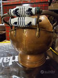 vaso in rame antico, manici in ceramica (uno rotto)