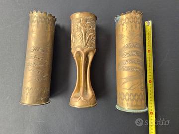 Questo oggetto è un vaso in stile "Trench Art" (arte di trincea), realizzato con un Bossolo di artiglieria della Prima Guerra Mondiale fronte Carsico Italia/Impero austroungarico, anno 1915/1917. Materiale: Ottone lavorato a sbalzo. Decorazioni: Motivi floreali incisi sulla parte inferiore. Origine: Tipicamente creato da soldati durante il periodo bellico in omaggio al medico in Trincea. Utilizzo attuale: Oggetto da collezione o decorativo.