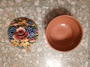 Vaso in terracotta smaltato degli anni '30 con coperchio, in perfette condizioni. Diametro 17 centimetri, altezza 12 centimetri. Un oggetto vintage da collezione. Spedisco in tutta Italia.