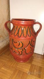 Il vaso è realizzato in terracotta e presenta una forma a due manici. La superficie è decorata con motivi geometrici e floreali dipinti a mano in tonalità arancioni e verdi.
