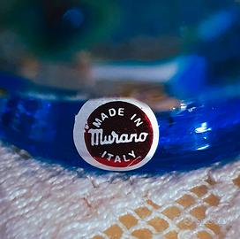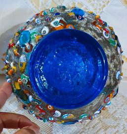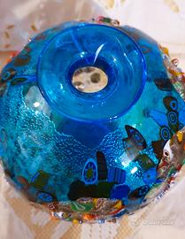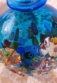 Vaso azzurro in vetro artistico di Murano e lavorazione con tecnica "Millefiori": parti in rilievo di mosaici di vetro colorati e fusi sullo sfondo.