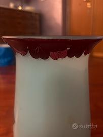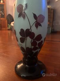 Vendo elegante vaso in vetro artistico caratterizzato da una lavorazione raffinata e da un forte impatto decorativo. Il vaso presenta un corpo slanciato con vetro opalescente azzurro chiaro, impreziosito da motivi floreali in rilievo di colore rosso rubino/bordeaux, sapientemente applicati a cammeo (tecnica con vetri sovrapposti e incisi).