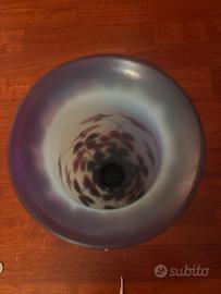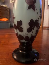 La parte superiore è rifinita con un bordo rosso scuro sfumato, mentre la base ampia e stabile è realizzata in vetro nero lucido. Sul fronte è presente una firma, che richiama lo stile dei maestri vetrai francesi del primo ’900.