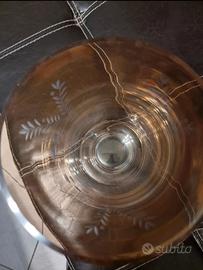 Elegante vaso in vetro con una finitura ambrata e decorazioni floreali incise. - Decorazione floreale incisa. - Base trasparente.