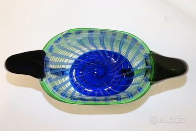 Materiale: Vetro trasparente con filigrana verde e blu e fili a spirale e macchie verdi e blu applicate a caldo