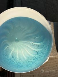 Ho questo bellissimo vaso in vetro color tirchese con effetto bagnato,forse di matrice veneziana, lo posseggo da molti anni ed è conservato senza difetti, per le misure osservare le immagini