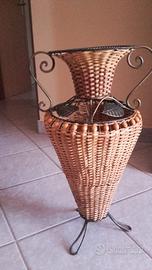 Vaso in vimini con struttura in ferro anticato e decorato come da foto, ottime condizioni, adatto come arredo da interno e/o esterno. diametro superiore é 23cm l'apertura vera e propria é 10cm il vaso é alto 63cm
