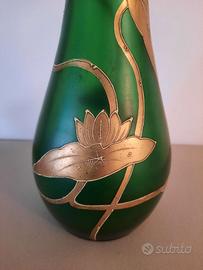 Vaso liberty , vetro verde opaco con decorazioni oro. periodo presunto 1890-1910 altezza 28,5 , base 8 (cm)