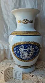 Il vaso presenta ricchi fregi in oro zecchino e motivi floreali, interamente decorati a mano come riportato dal sigillo originale. Un pezzo di grande eleganza, ideale per collezionisti o come complemento d'arredo classico di alto livello. Corredato di cartiglio descrittivo originale.