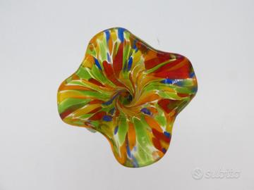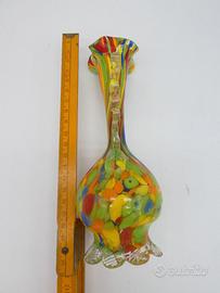Elegante vaso in vetro soffiato di Murano, alto circa 21 cm, attribuito alla storica fornace Fratelli Toso, attiva a Murano dal 1854 e tra le più importanti nella tradizione artistica veneziana. Il vaso presenta una vivace decorazione policroma a macchie, tipica delle produzioni degli anni '30-'40, con dettagli lavorati a mano, base scanalata e corpo bombato.