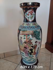Vaso decorativo in ceramica in stile orientale, riccamente dipinto con scene tradizionali, figure, fiori e dettagli colorati. La superficie è molto lavorata e presenta motivi complessi e vivaci, tipici della produzione asiatica.