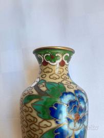 #cofanetto regalo con Vasetto, orientale cinese smaltato beige , estremità colore verde smeraldo tiffany ,decorato con fiori peonia blu viola , bordato color oro ; ottenuto da una minuziosa lavorazione artigianale orientale con la tecnica a riempimento con smalti su intarsi in metallo .