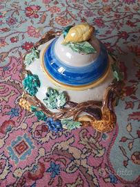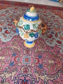 Vendo splendido vaso/anfora decorativa in ceramica smaltata completa di coperchio. Un pezzo artigianale di grande impatto visivo e dai colori vivaci, ideale per arricchire e dare carattere ad ambienti rustici, cucine classiche, tavernette o da esporre su una bella credenza in legno. Caratteristiche: Struttura: Realizzato in corposa ceramica smaltata, con base circolare e corpo centrale bombato. Il coperchio a cupola è arricchito da eleganti fasce concentriche nei toni del blu e del giallo ocra, e culmina con un bellissimo limone a tutto tondo che funge da pratico pomello. Dettagli: Il vero punto di forza di questo oggetto è la ricchissima decorazione tridimensionale ad altorilievo che ne avvolge l'intera superficie: tralci di vite intrecciati, foglie verdeggianti e voluminosi grappoli d'uva dipinti a mano nei toni del giallo e del viola. Un classico e intramontabile esempio di artigianato ceramico italiano (che richiama le celebri manifatture in stile Bassano). Condizioni: L'oggetto si presenta in buone condizioni generali ed è un pezzo solido, pronto per essere esposto e ammirato in tutta la sua bellezza e particolarità. Solo ritiro a mano a Torino (zona Santa Rita). Non si effettuano spedizioni. Disponibile per altre foto. Prezzo trattabile.