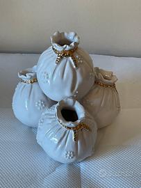 Questo oggetto è un vaso decorativo in ceramica bianca, caratterizzato da un design che ricorda diversi sacchetti uniti tra loro, con dettagli rifiniti in oro. Ideale come complemento d'arredo per la casa o come oggetto da collezione. Misure: 14x14
