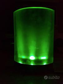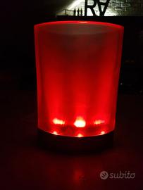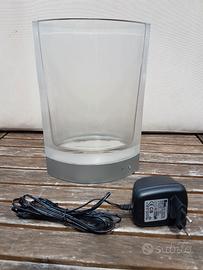Vaso in vetro per fiori recisi, o altro uso ( può essere riempito di acqua ) con base in plastica. Sul fondo sono presenti una serie di Led che illuminano il vaso. Può essere selezionato un singolo colore o la dissolvenza dei colori in forma automatica. Fornito con alimentatore per la ricarica della batteria interna e istruzioni. Usato pochissimo, è in ottime condizioni d'uso.